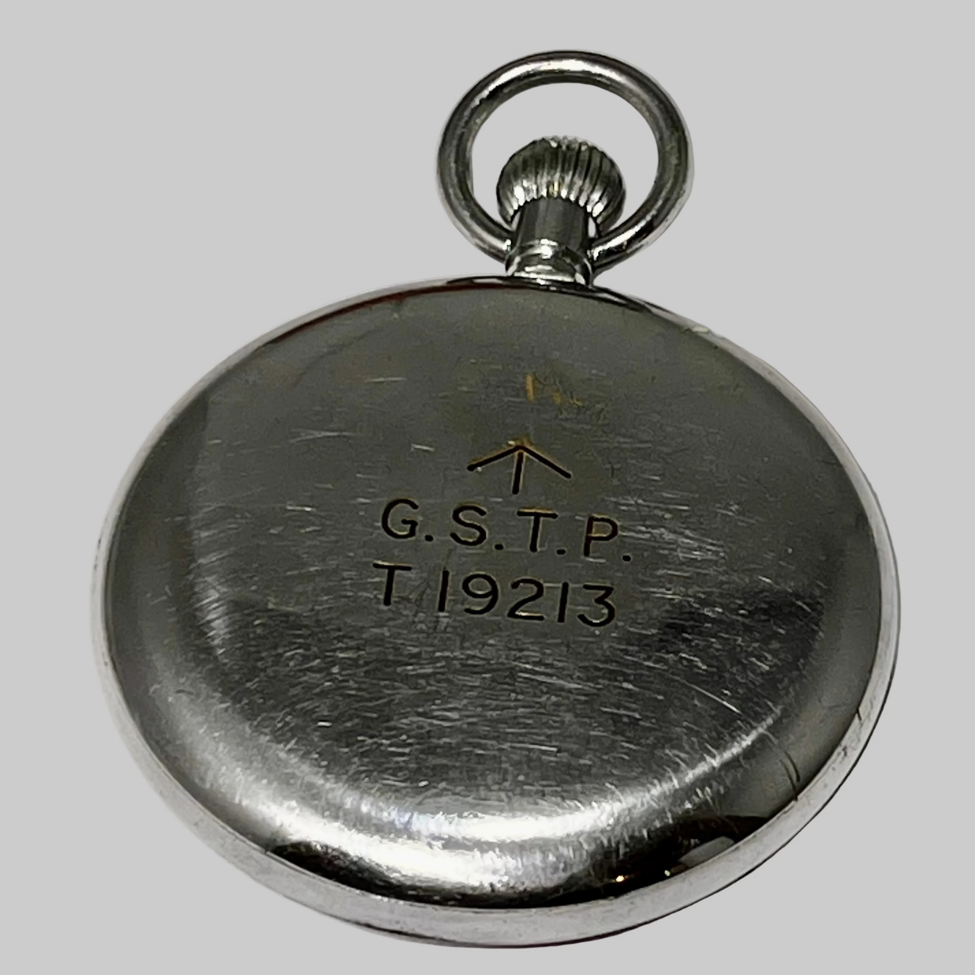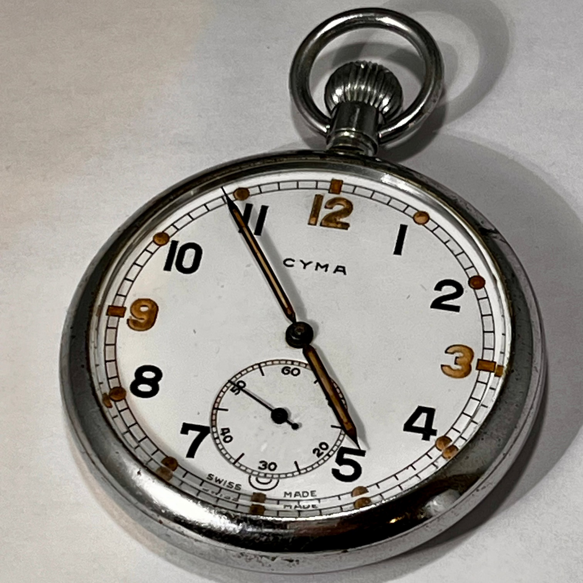 This is a WW2 Era British Military Pocket Watch manufactured by Cyma. Watch is in very good condition for a vintage military watch with a nice original enamel dial and broad arrow markings on back of case. Case is chrome-plated brass with snap-on back & bezel. Case is 52.5 mm wide.