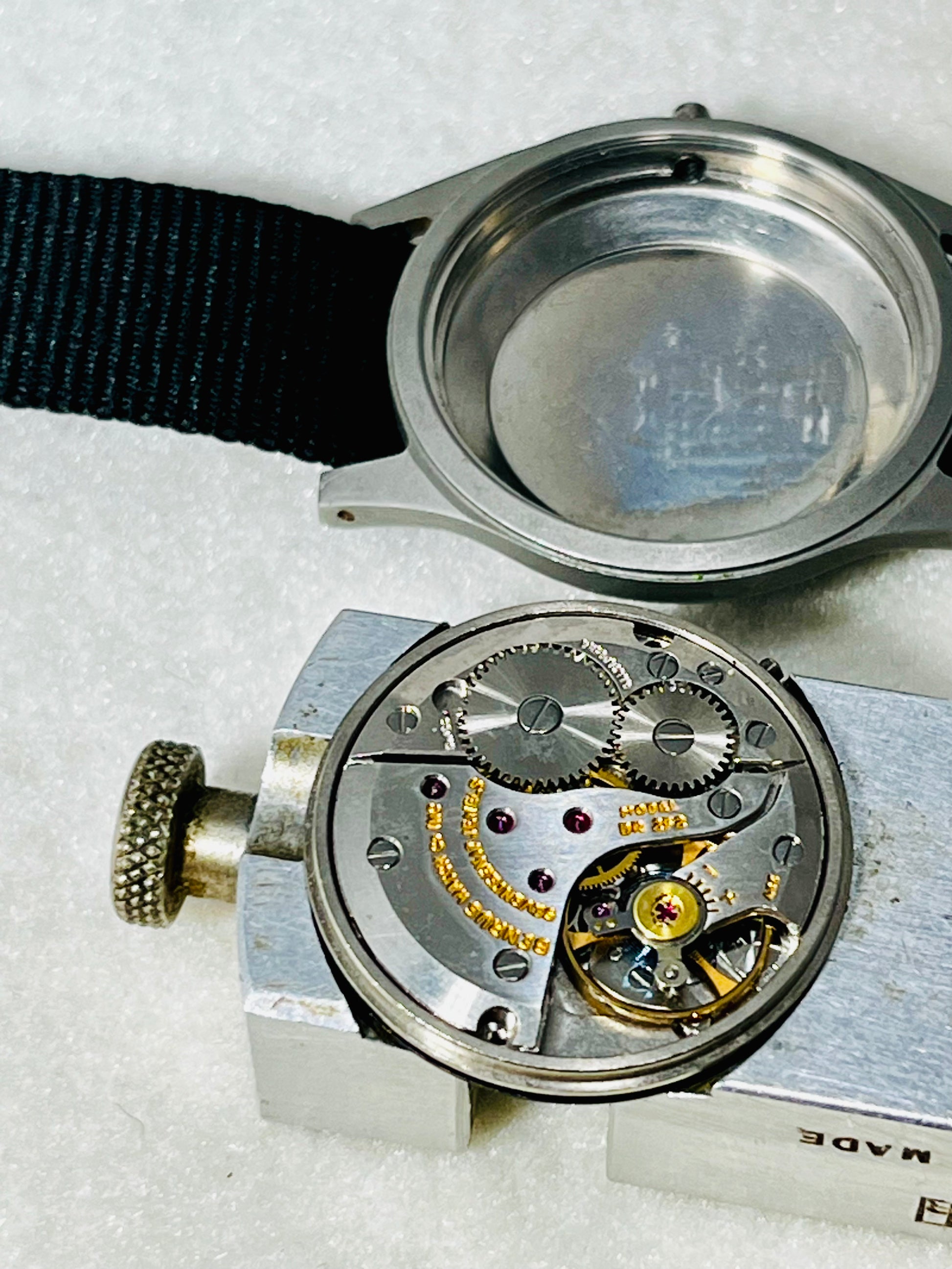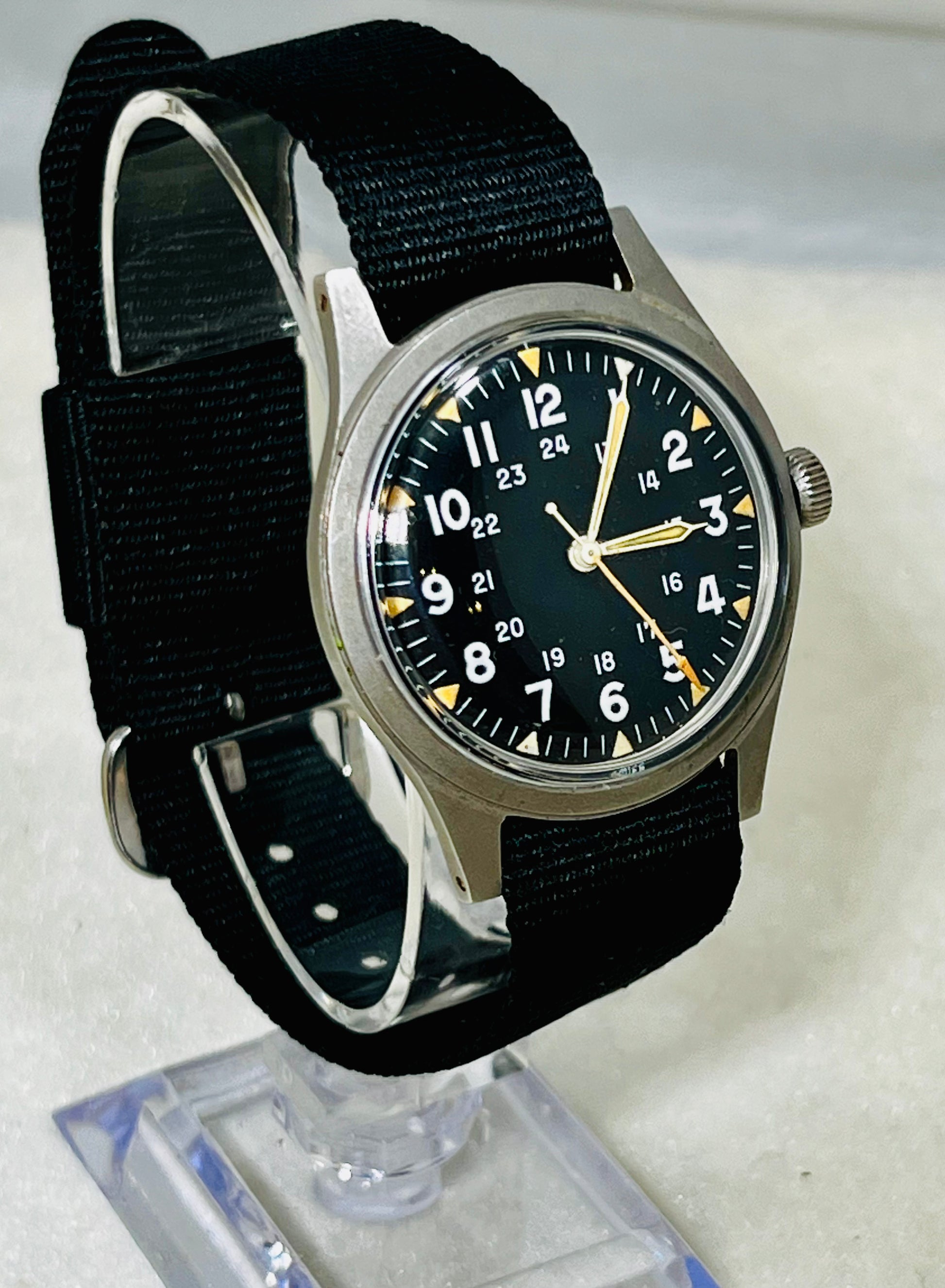 Watch is in excellent condition for a vintage military watch. The watch is has been timed on our timing machine and is running and keeping time. When fully wound, watch was within 7 seconds a day (dial up) with an amplitude of approximately 300 degrees. Watch winds and sets fine and the Hack function works properly.