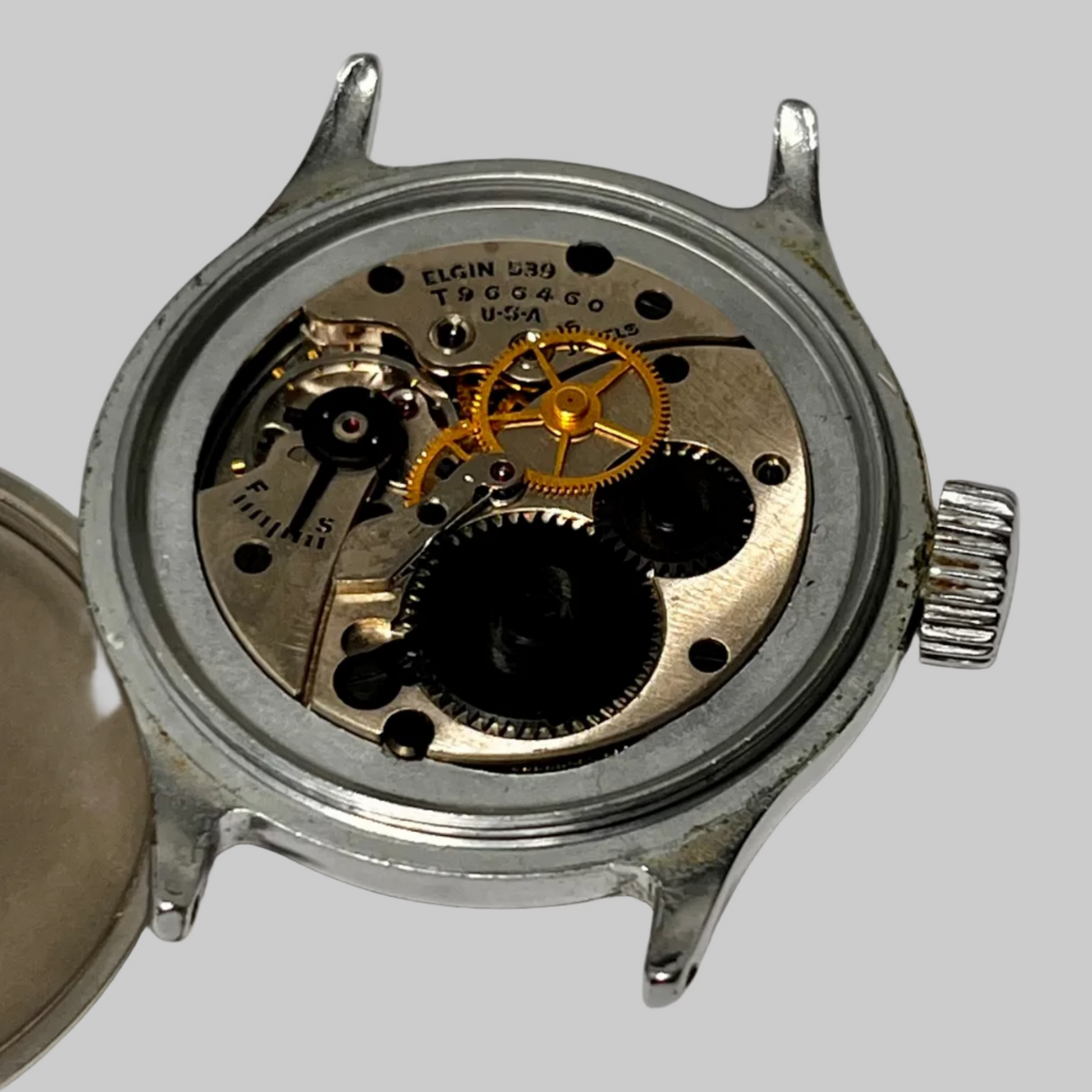 Up for sale we have a Model A-11 circa 1945 WW2 Military Issue aviator's wrist watch manufactured by Elgin. Watch is housed in a two-piece steel case. Movement is a grade 539 16-jewel model 2114 mechanical (wind up) movement with hacking device. Movement serial number T966460.
