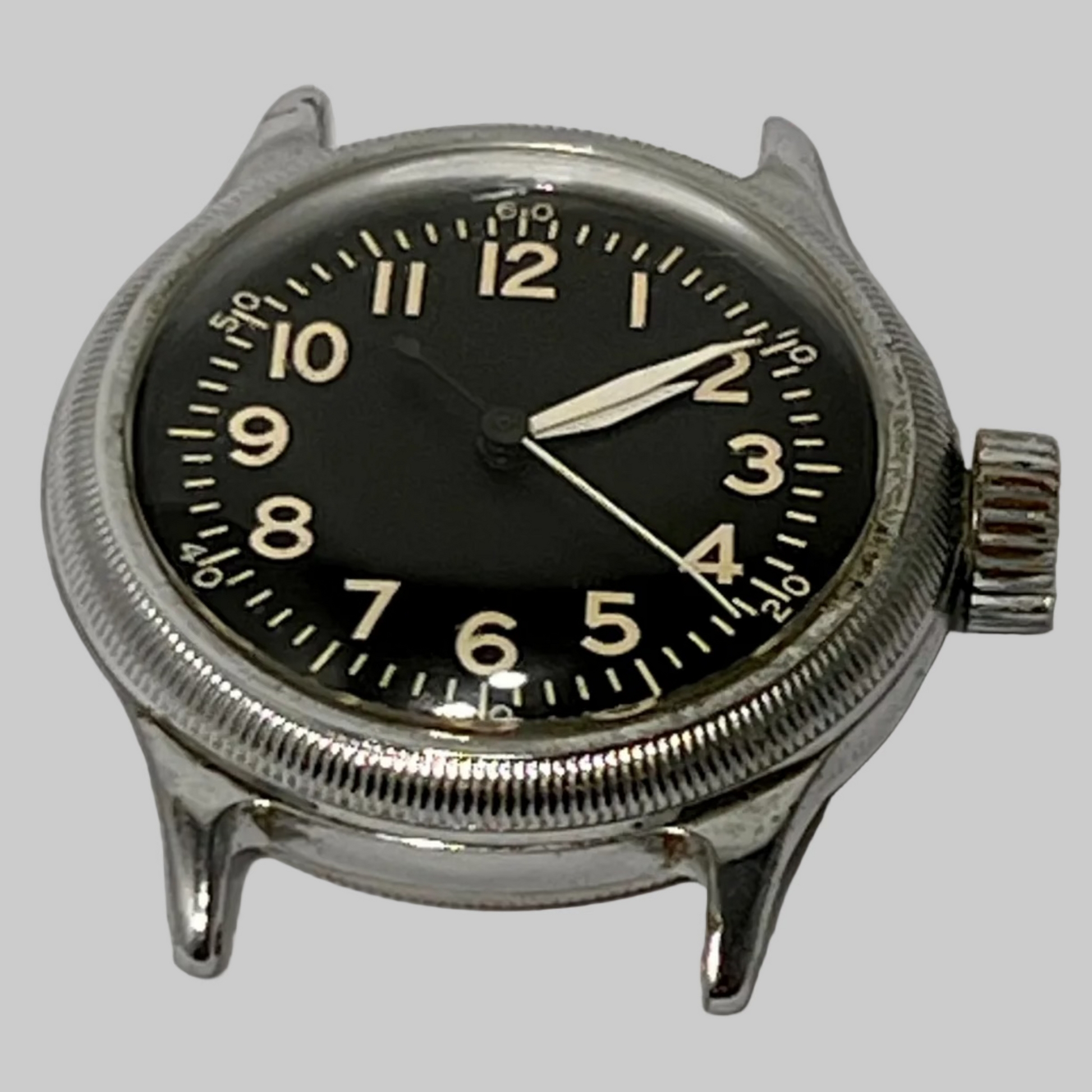 Watch is in excellent condition for a vintage military watch. The watch is has been timed on our timing machine and is running and keeping time. When fully wound, watch was within 5 seconds a day (dial up) with an amplitude of approximately 270 degrees. Watch winds, sets, and hacks properly.